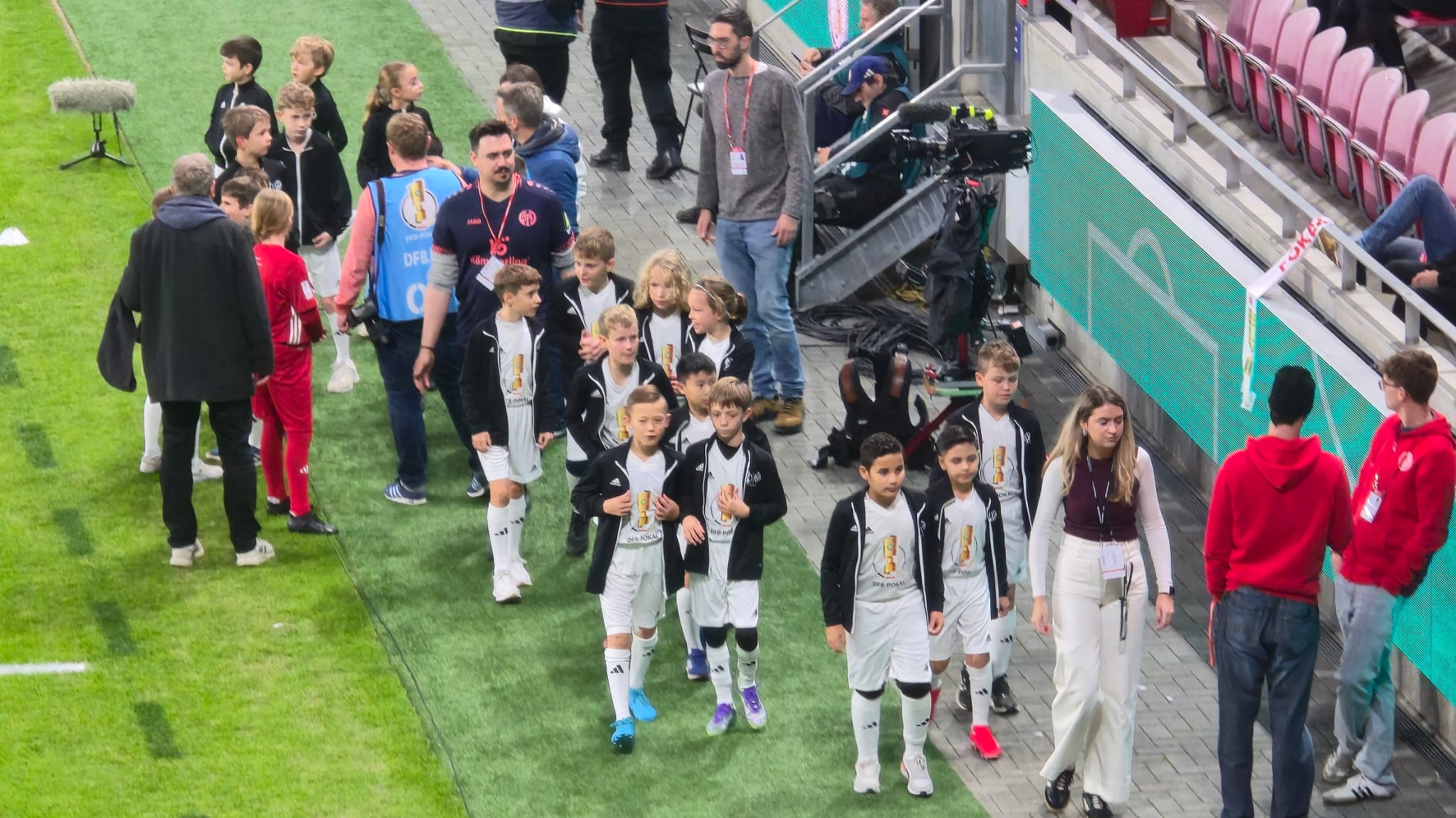 Die D2-Verantwortlichen kamen unverhofft zu einer großen Überraschung für ihre Mannschaft. Sie wurden von einem Mainzer Organisator des Pokal-Events angesprochen: „Wollt ihr beim Einlaufen de Mainzer Spieler beim Pokalspiel gegen Stuttgart dabei sein?“ Die Nachricht haute alle um. Man zögerte keine Minute und und sagte sofort zu.