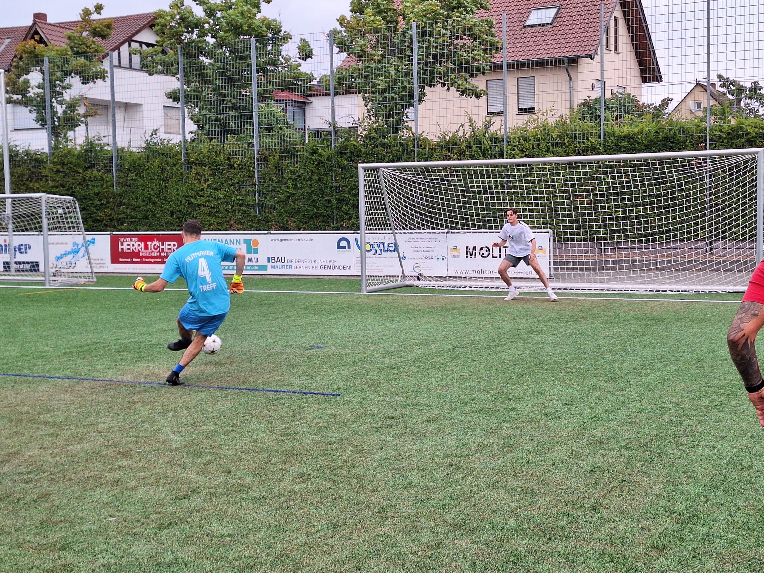 Trotz Urlaubszeit war der Elferkrimi wieder schnell ausgebucht und das Teilnehmerfeld mit 27 Mannschaften mehr als voll besetzt. Die Namen der Teams und Trikots waren kreativ wie eh und je: Hangover96, 1. FC Alkopop, Glashoch Rangers, Dynamo Dosenbier und viele andere. Dabei waren die Jüngsten die „Bambini Bomber“ aus unserer F-Jugend mit „Routinier“ Roman im Tor, der ein Ausscheiden in der Gruppenphase leider auch nicht verhindern konnte. Wir können uns aber hoffentlich auf Teilnahmen dieser Nachwuchskicker auch in der Zukunft freuen. Mit ihren schicken Trikots waren sie aber auf jeden Fall schon einmal ein Hingucker im Teilnehmerfeld.